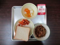 【本日の献立】 牛乳・ご飯、豆腐ハンバーグの紅葉あんかけ 豚肉と大根の煮物、あいまぜ