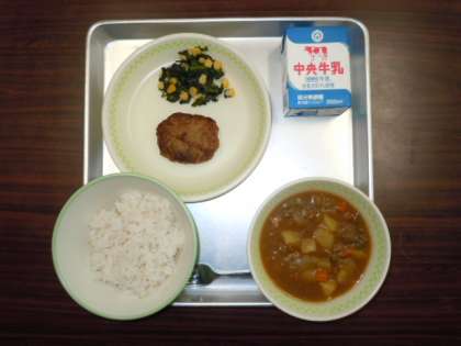 麦ごはん、カレーシチュー、ハンバーグ、ほうれん草とコーンのソテー、牛乳