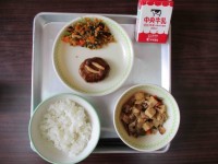 麦ごはん、人参ピラフの具、鶏肉のハーブマスタード焼き、白菜スープ、セレクトケーキ、牛乳