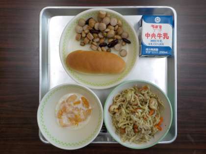 小型ロールパン、碧南焼きそば、ウインナーのビーンズソテー、フルーツヨーグルト、牛乳