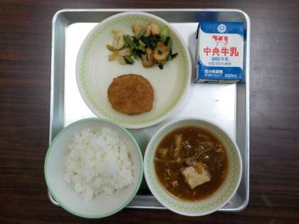 ご飯、鶏ごぼう汁、キャベツ入りメンチカツ、小松菜とちくわのあえもの、牛乳