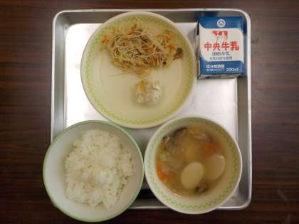 ご飯、トック、コーンしゅうまい、焼きビーフン、牛乳