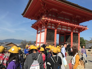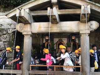 修学旅行最初の見学地の清水寺に到着しました。清水の舞台は迫力満点でした。音羽の滝では、真ん中を選ぶ子が多くいました。真ん中は恋愛の願いが叶うと言われています。