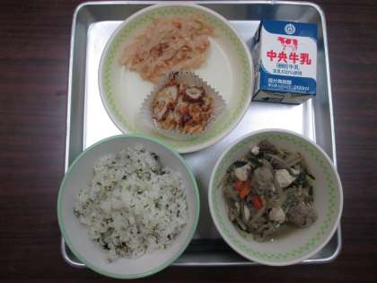 わかめごはん、ちくわのマヨネーズ焼き、ちゃんこ煮、だいこんサラダ、牛乳
