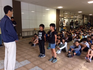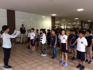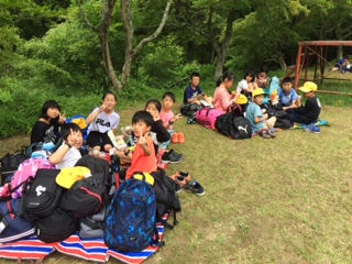 5年生全員153名、野外教育センターに着きました。昼食は外で食べることができましたが、開校式は雨のため中で行いました。