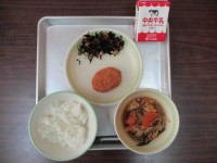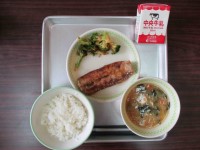【本日の献立】牛乳・ご飯、いかフライのレモン煮、青菜あえ、根菜の豚汁