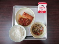 【本日の献立】牛乳・ご飯、とんかつの甘酒みそだれかけ、桃の節句のふりかけ、花ふ汁、ひなあられ