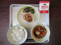 【本日の献立】牛乳・ご飯、エビカツ、大豆とひじきのピリ辛炒め、春の山菜汁
