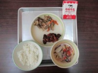 【本日の献立】牛乳・ご飯、豚肉のいちじくソース、大豆サラダ、焼き麩汁、ノンエッグ...