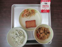 【本日の献立】牛乳・わかめご飯、焼きはんぺん、高野豆腐の卵とじ、根菜サラダ