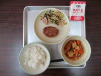 【本日の献立】牛乳・ご飯、キャベツ入りメンチカツ、じゃがいもとツナのうま煮、大根...