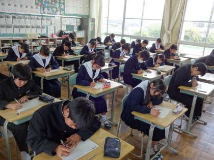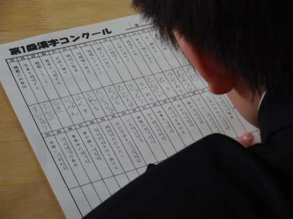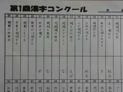 この日授業の最後の時間を使って第1回目の漢字コンクール(読み25問、書き25問)を行いました。毎年1回目は全校同じ問題です。全問正解した生徒には満点賞、各学年の合格基準に達した生徒の多いクラスにクラス賞が贈られます。この日を目指して各クラス、個人で努力してきたクラス、人も多いようです。ひとりでも多くの人が満点賞、合格を得てほしいと思います。ちょっとやってみてください。
