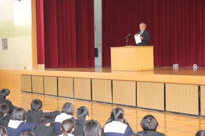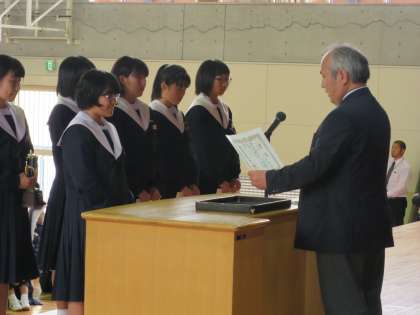 午前中で中間テストも終わり、午後全校集会を行いました。表彰では、ゴールデンウィークの大会で活躍した女子テニスの長田さん、石原さん(3年)、遠藤さん、山本さん(2年)、バレー部、女子卓球の山岸さん(2年)が表彰されました。校長先生からは基礎基本の大切さのお話がありました。また、あいさつ力チェックもまた始まるとのことでした。クラスでまとまってあいさつ力を高めていきましょう。
