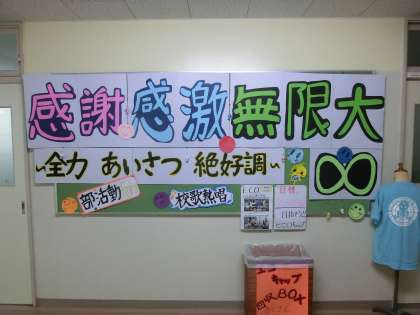 昨日発表された前期生徒会のスローガン、「感謝☆感激☆無限大∞、〜全力・あいさつ絶好調〜」の文字が生徒会室の掲示板にはってありました。