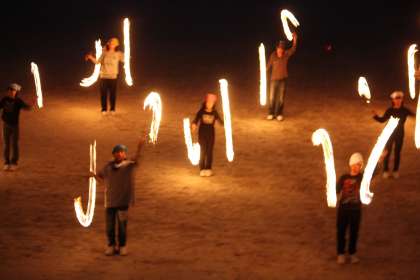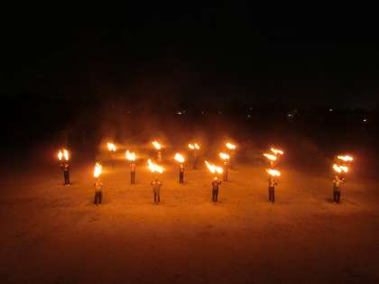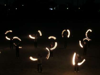 2年生が来週のみどりの学校を前に、火の舞のリハーサルを行いました。夜7時、当日火の舞を演じるメンバーがジーンズに黒系のTシャツで集まり、多くの保護者や先生方の前で実際に火をつけてリハーサルを行いました。幸い今晩は風もなく絶好のコンディションで、練習の成果を披露することができました。見学に集まった保護者、家族、先生たちからたくさん拍手をもらっていました。