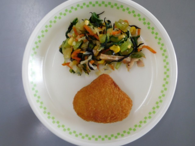 牛乳、ごはん、炒り豆腐、いもくりコロッケ、ひじきと野菜のあえもの
