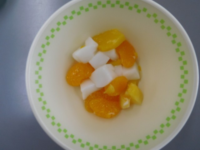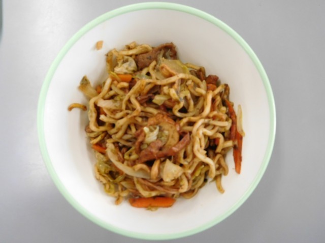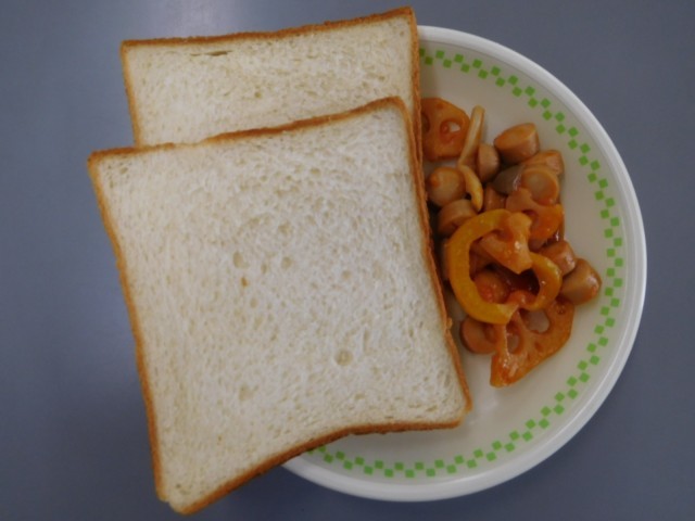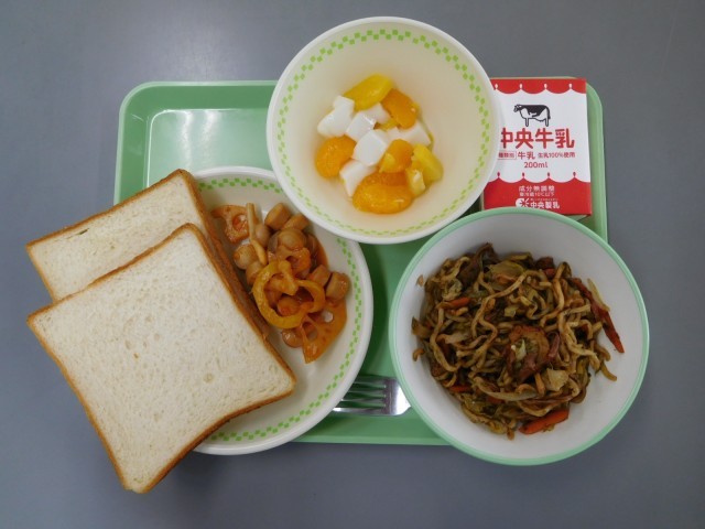 牛乳、スライスパン、焼きそば、ウインナーとレンコンのチリソース煮、杏仁豆腐