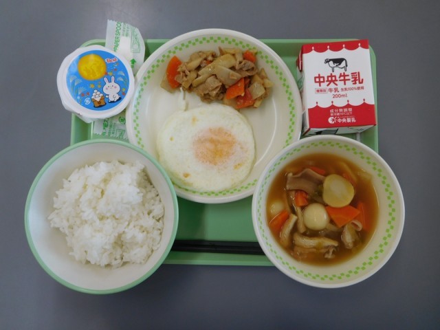 牛乳、ごはん、月見玉子焼き、豚肉と里芋の甘辛炒め、十五夜汁、月見デザート