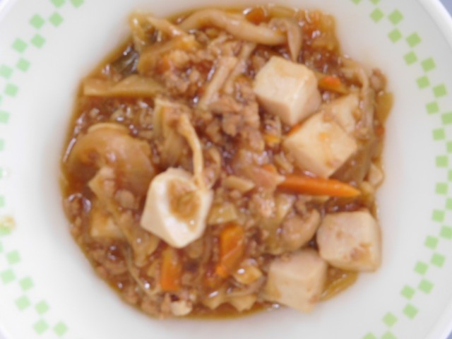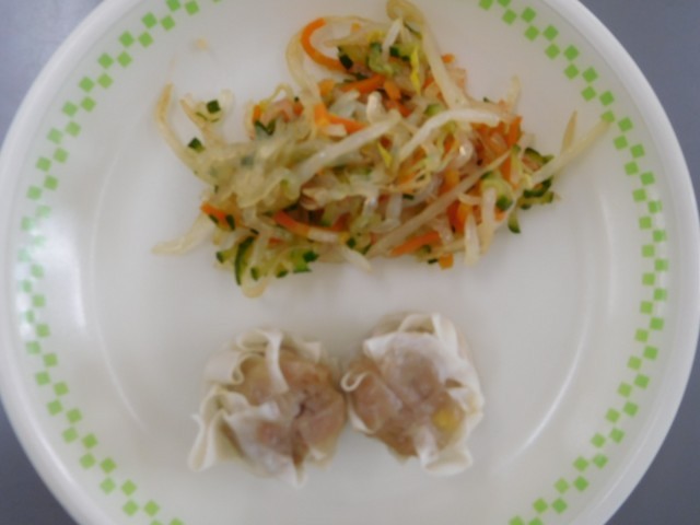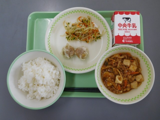 牛乳、ごはん、コーンしゅうまい、マーボーきのこ、中華あえ