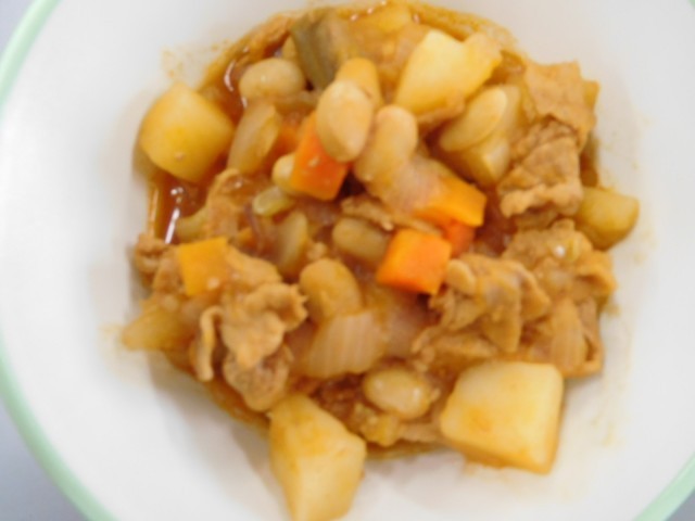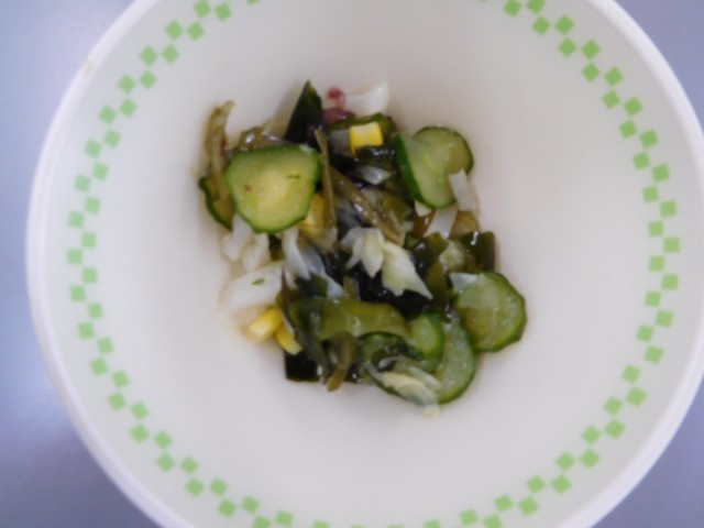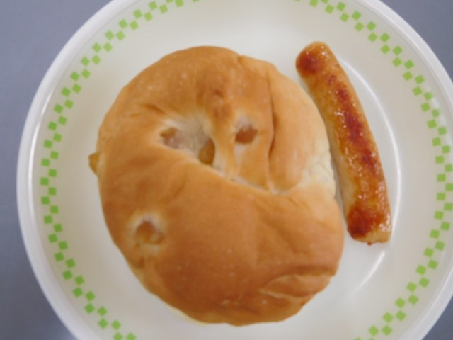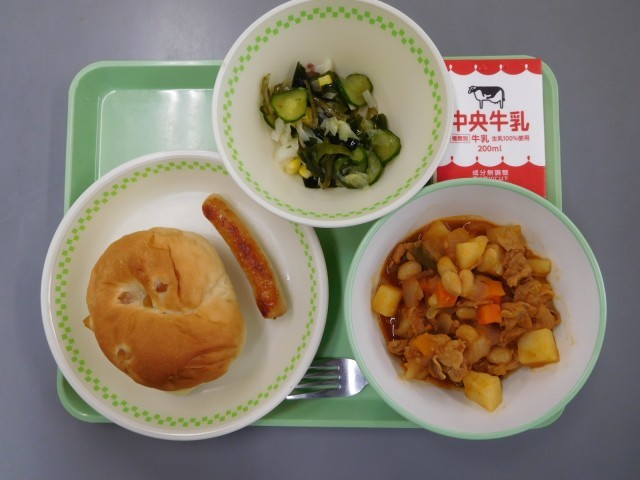 牛乳、りんごパン、ウインナー、ポークビーンズ、海草サラダ、青じそドレッシング