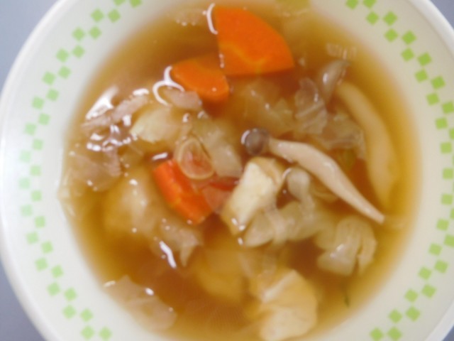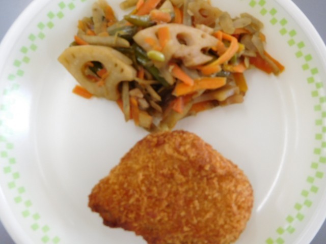 牛乳、わかめごはん、ソフトカレイフライ、れんこんのきんぴら、えび団子汁