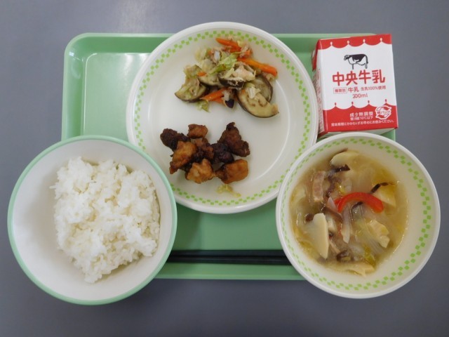 牛乳、ごはん、鶏肉とレバーのさっぱりソース、なすの塩炒め、トック