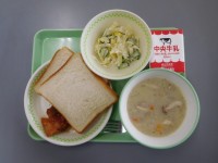 牛乳、ごはん、ツナのピリ辛みそ炒め、春巻き、中華スープ