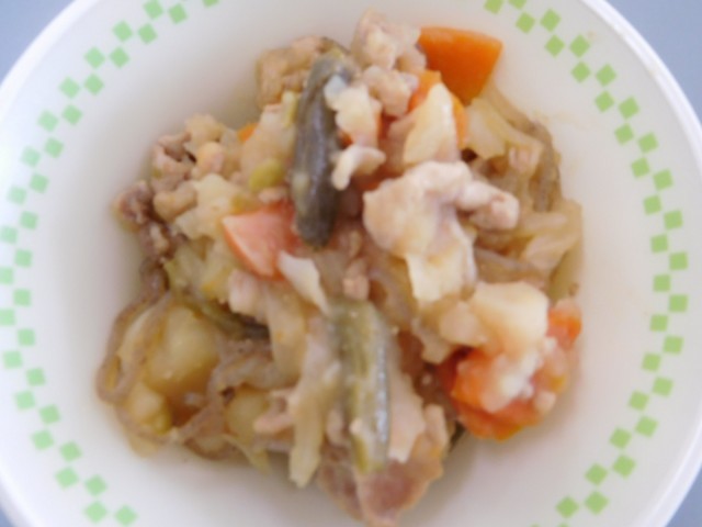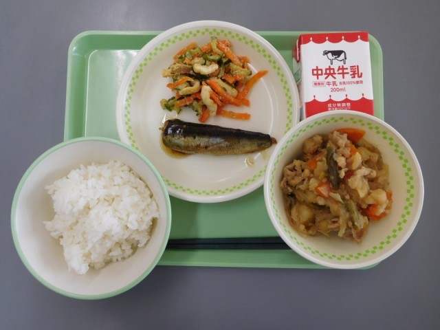 牛乳、ごはん、イワシの梅煮、肉じゃが、あいまぜ