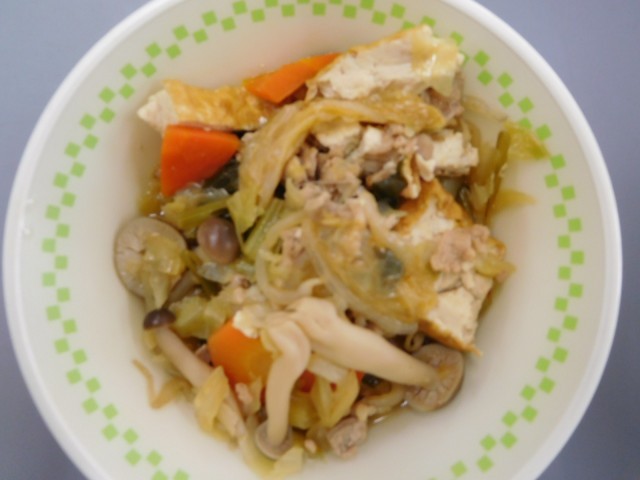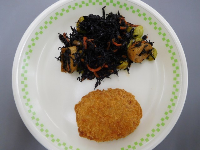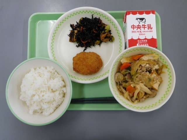 牛乳、ごはん、とんかつ、ピリ辛なべ、ひじきの炒め煮