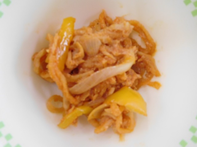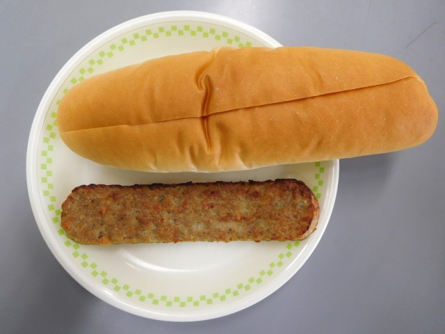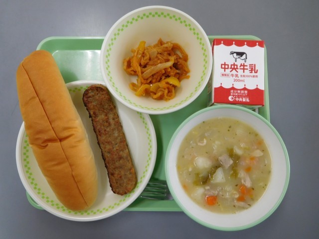 牛乳、サンドイッチロールパン、ハンバーグ、白菜のクリームシチュー、切干大根のナポリタン