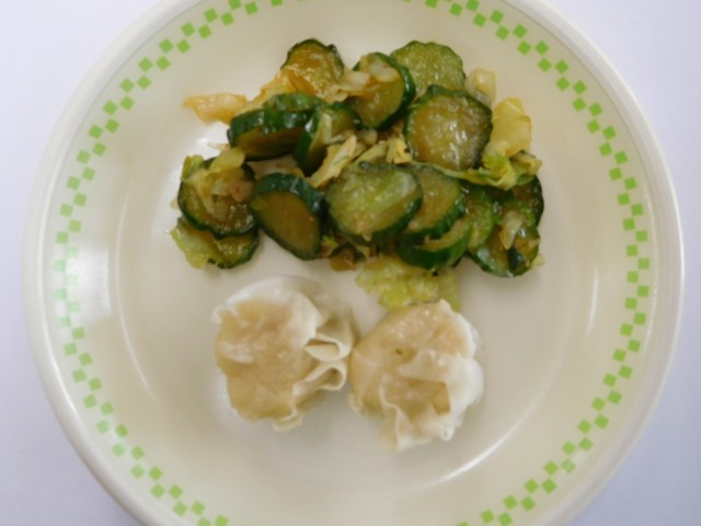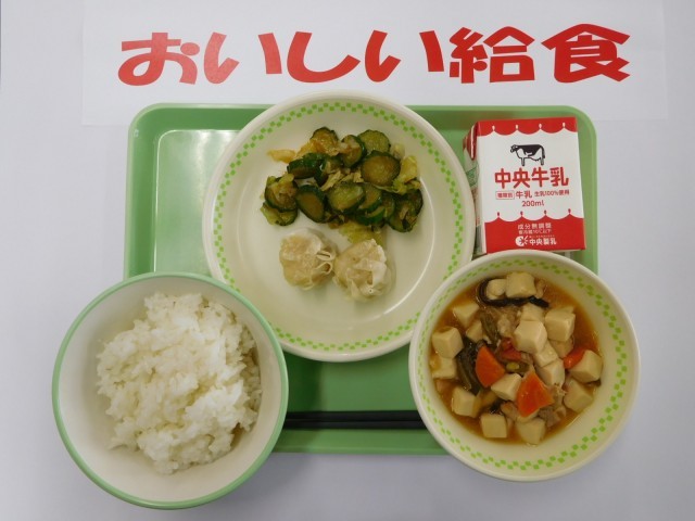 牛乳、ごはん、えびシューマイ、豆腐の中華風煮、やみつききゅうり