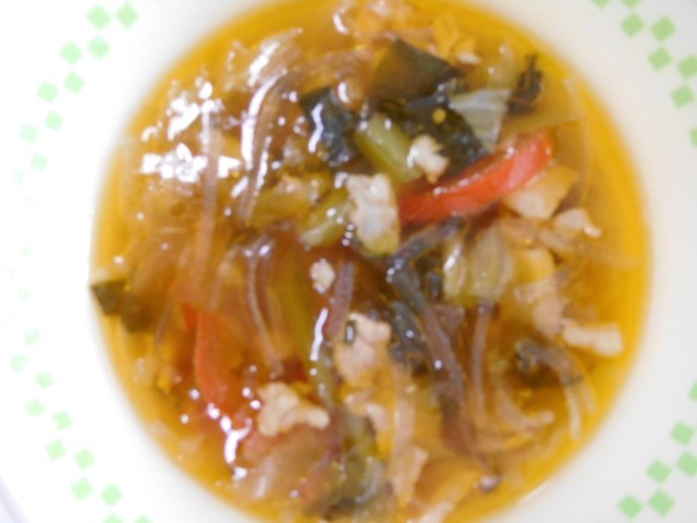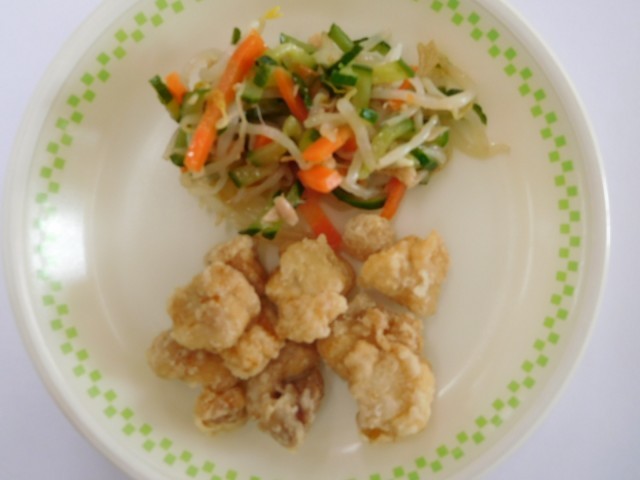 牛乳、ごはん、鶏の塩唐揚げ、白だしナムル、タイピーエン