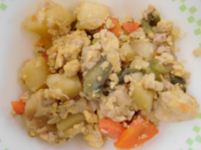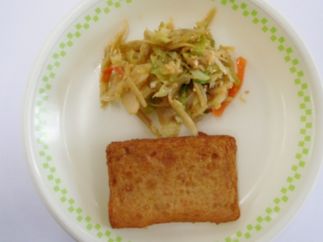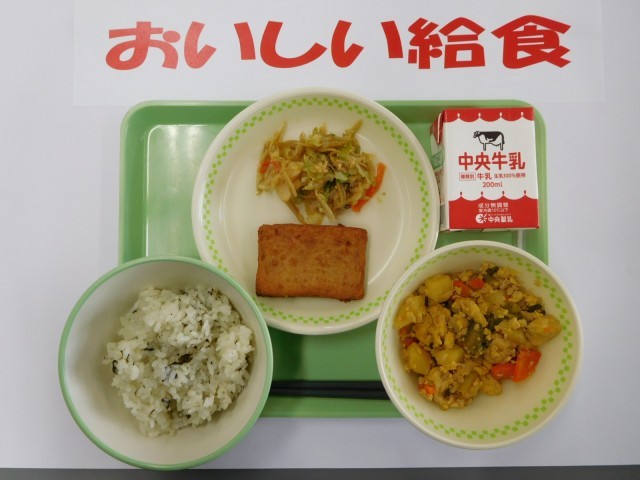 牛乳、わかめごはん、焼きはんぺん、高野豆腐の卵とじ、根菜サラダ