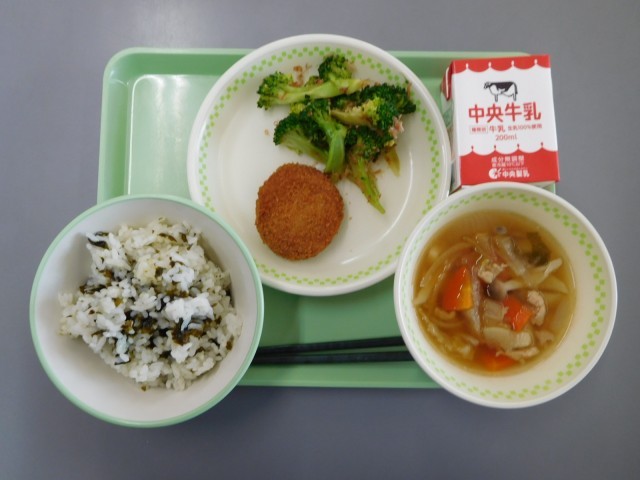 牛乳、わかめごはん、とんかつ、ブロッコリーのおかかあえ、野菜たっぷり汁