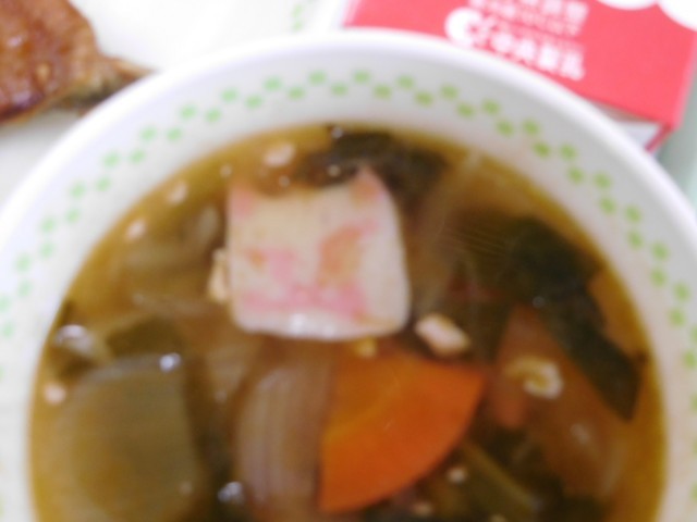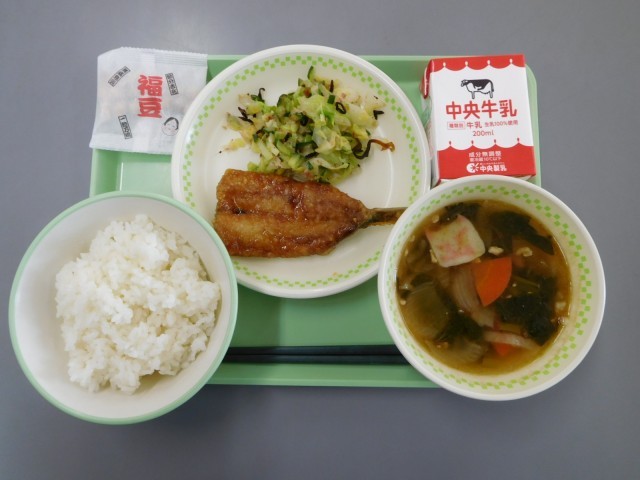 牛乳、ごはん、いわしのかば焼き、キャベツの梅塩昆布あえ、節分すまし汁、節分豆