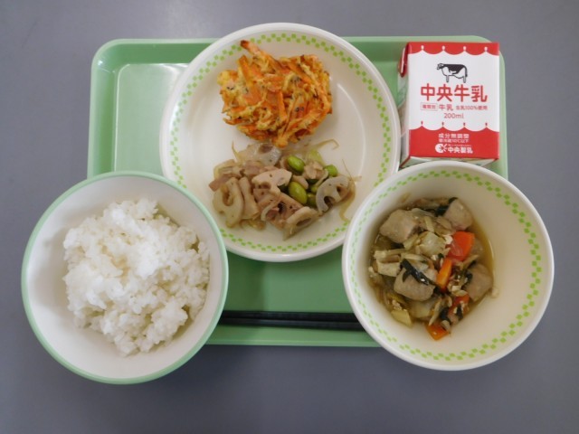牛乳、ごはん、ちゃんこ煮、れんこんの生姜風味炒め、碧南にんじんかき揚げ