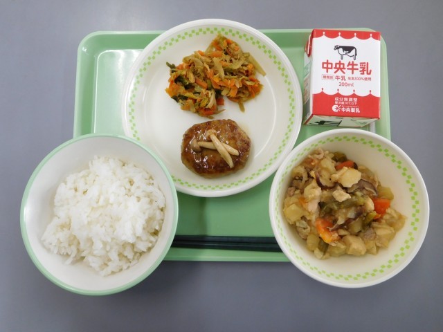 牛乳、ごはん、ハンバーグのきのこあんかけ、高野豆腐の煮物、にんじんのカレー炒め