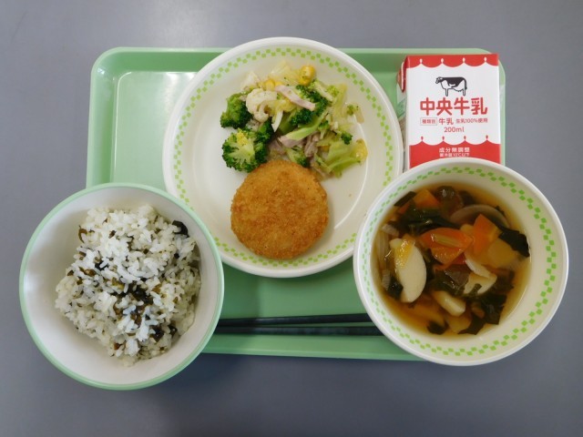牛乳、わかめごはん、チキンカツ、花野菜サラダ、ほうれんそうのすまし汁、和風ドレッシング