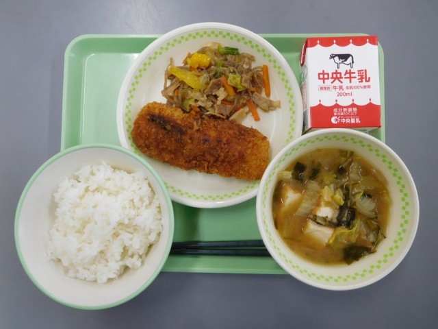 牛乳、ごはん、イカフライの梅ソース、こんにゃくソテー、白菜の味噌汁