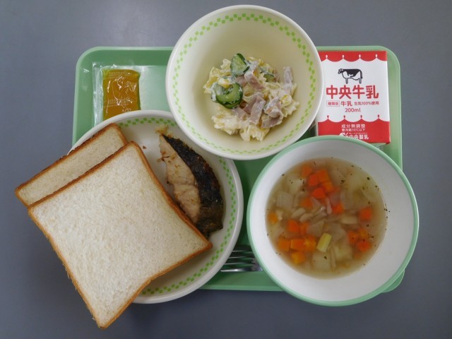 牛乳、スライスパン、鮭のチーズパン粉焼き、りぼんマカロニサラダ、コンソメスープ、みかんジャム、ノンエッグマヨネーズ