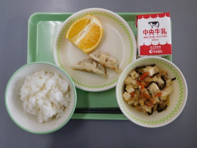 牛乳、ごはん、豆腐のオイスターソース炒め、蒸しぎょうざ、はっさく