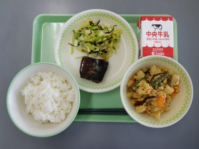 牛乳、ごはん、さばの味噌煮、高野豆腐の卵とじ、塩昆布あえ