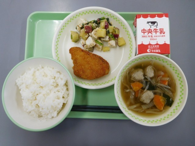 牛乳、ごはん、ソフトカレイフライ、鶏団子汁、さつまいもとわかめの白あえ風サラダ