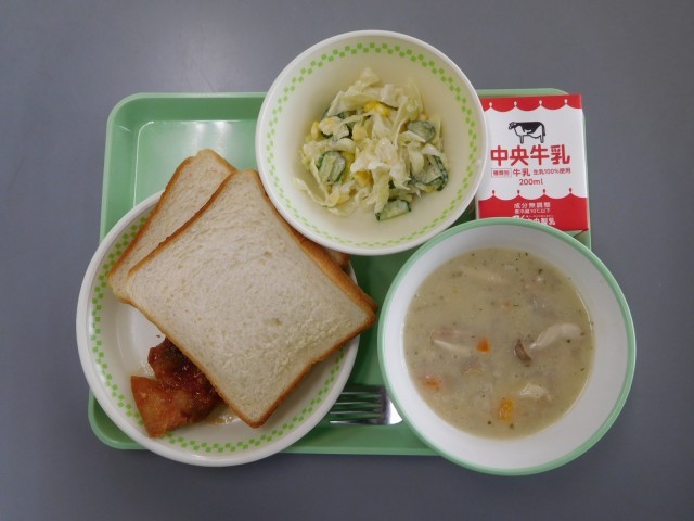 牛乳、スライスパン、鶏肉のバーベキューソース、シーザーサラダ、クラムチャウダー、シーザーサラダドレッシング(乳なし)