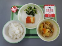 牛乳、クロロールパン、鶏肉とさつまいものマヨネーズグラタン風、野菜ソテー、根菜ス...