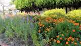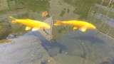 メイン花壇の花、クスノキと1棟の校舎、池の鯉です。学校には、ビオトープの水を求めて、たくさんの鳥や虫が集まってきます。