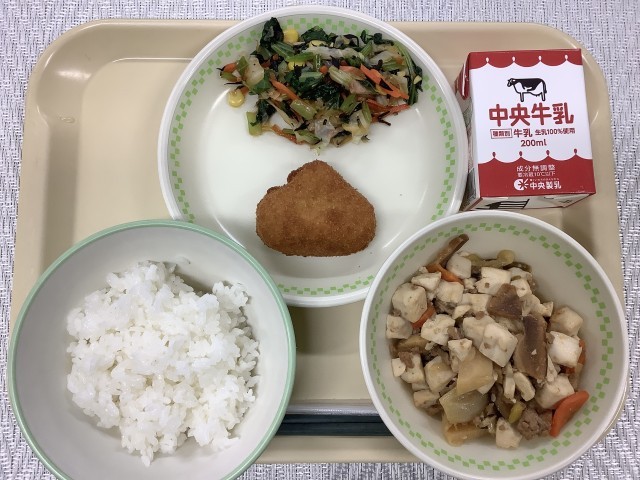 今日は、栗の形をした かわいい「いもくりコロッケ」です。栗は、秋に おいしくなる 食べ物です。栗ごはんにしたり、お菓子にしたりしても おいしいですね。実は、栗は5500年前くらいから 日本でも食べられていたそうです。ほくほくとした 栗の美味しさは、大昔の日本人も 知っていたのですね。また、今日のコロッケには栗の他にも さつまいもが入っています。秋のおいしさが 盛りだくさんのコロッケですね。