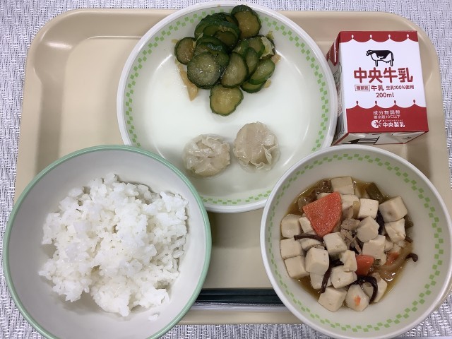 大人気の「やみつききゅうり」の登場です。耳を ふさいで食べると、きゅうりやキャベツを かむときの しゃきしゃきとした音が聞こえます。やみつききゅうりは 野菜を ゆでて作っていますが、しゃきしゃき感を残すために、調理員さんが ゆで方を工夫してくれています。食べ物の音も、食事の楽しみ方の一つです。どの食べ物から どんな音が するか、考えながら食べてみるのも おもしろいですね。