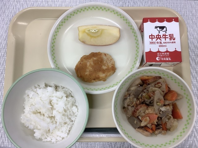 秋に おいしくなる「りんご」の登場です。りんごは、「1日1個の りんごは医者を遠ざける」という ことわざが あるほど、体によい食べ物です。目の疲れを とったり、病気から体を守ったりする働きが あります。寒くて かぜを引きやすい これからの季節に食べたい果物です。みなさんは、りんごの皮をむいて食べますか?皮つきのまま食べますか?りんごの皮や 皮の下には、栄養がたくさん含まれています。今日のように皮ごと りんごを食べると、もっと健康に なれそうですね。