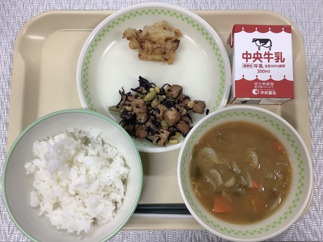 りんごの季節に登場する給食のメニュー「たまりん」の登場です。たまりんは、たまねぎと りんごの かき揚げです。調理員さんが 一つひとつ 形を作って揚げてくれました。りんごが入った かき揚げと聞いて びっくりした人や おいしいのかなと ドキドキした人が いるのではないでしょうか?りんごの甘酸っぱさが、たまねぎと よく合い、油で揚げることで 香ばしさも加わって、何とも言えない おいしさでしたね。